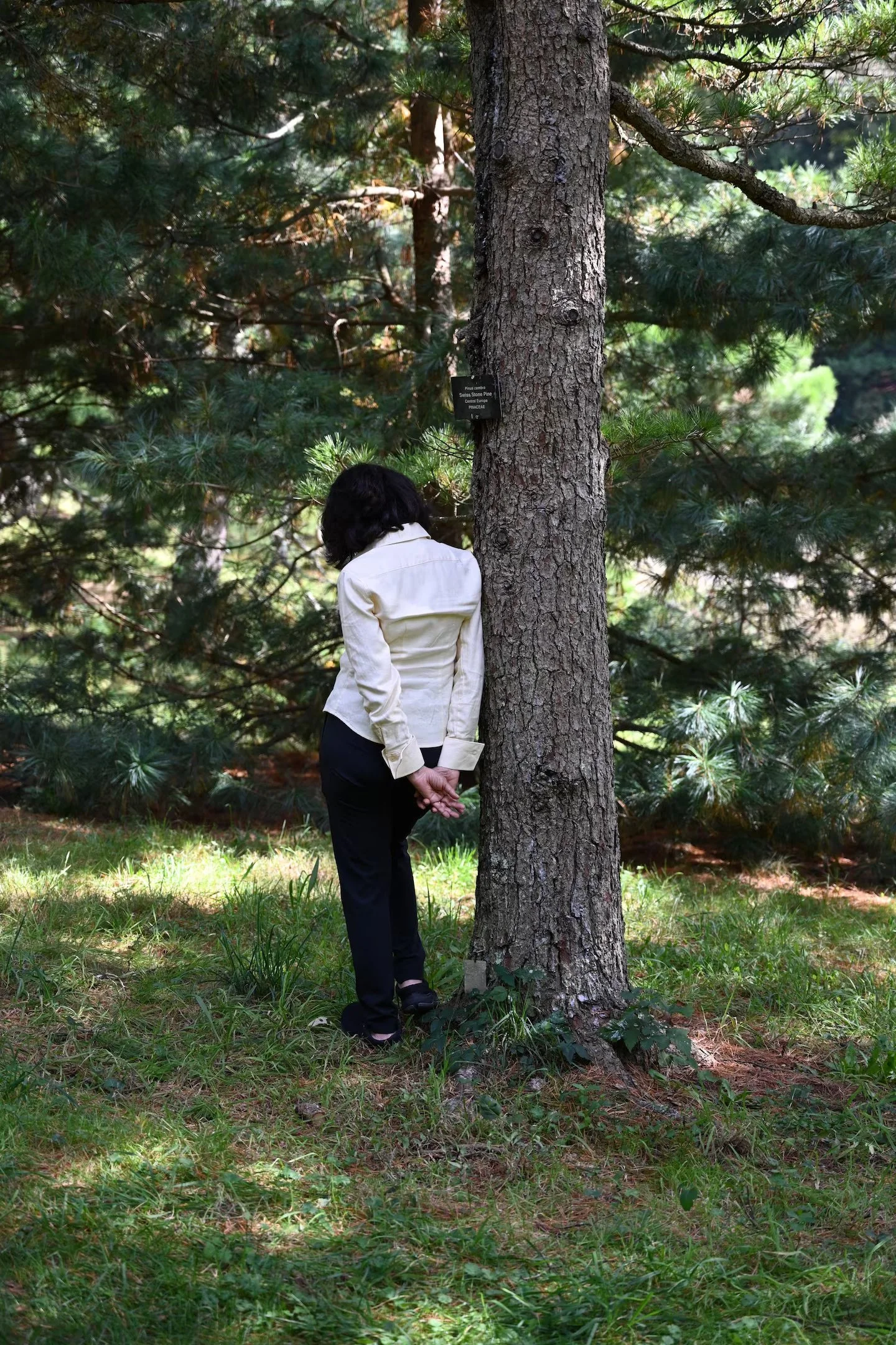 It was a warm fall day when I followed Abookire into the arboretum. The asters were blooming, and the jays and squirrels were conducting their affairs in a grove of conifers. “I’m letting my heart lead me to where it feels magical today — and also practical,” Abookire explained. In this case, the practical considerations were significant: The ambulances approaching Faulkner Hospital across the street, and a landscaping crew in the park operating mowers and a wood-chipper, drove us deeper into the grounds.